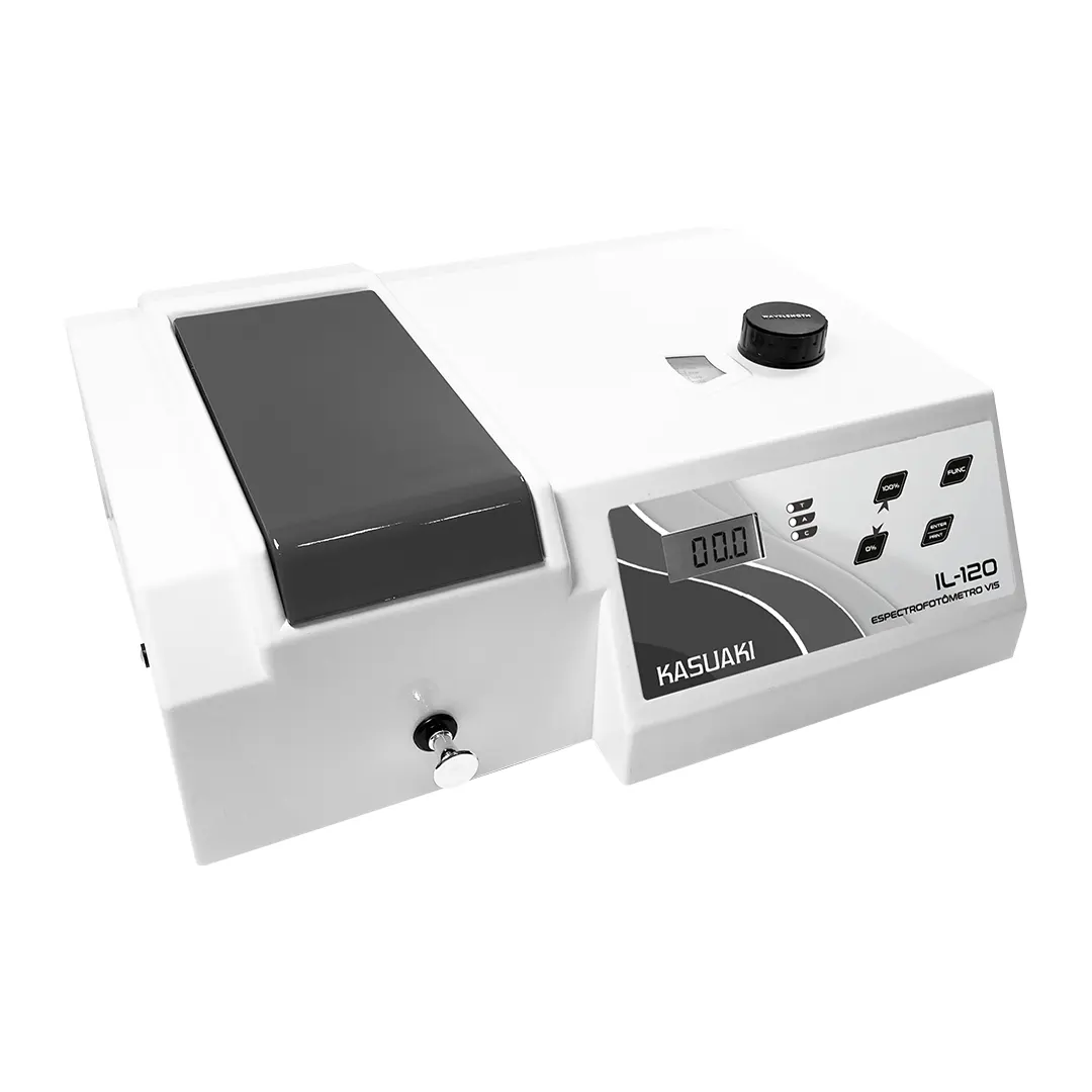 O espectrofotômetro Kasuaki IL-120-BI é um equipamento econômico, preciso e de fácil utilização. Possui uma tela LCD retroiluminada para auxiliar na visualização dos parâmetros, além de ter a possibilidade de impressão dos resultados. Realiza leituras de Absorbância, Transmitância e Concentração, além de ajuste de comprimento de onda, ajuste zero e 100%T. Equipado com um monocromador de 1200 linhas/mm que possibilita alta precisão e resolução.